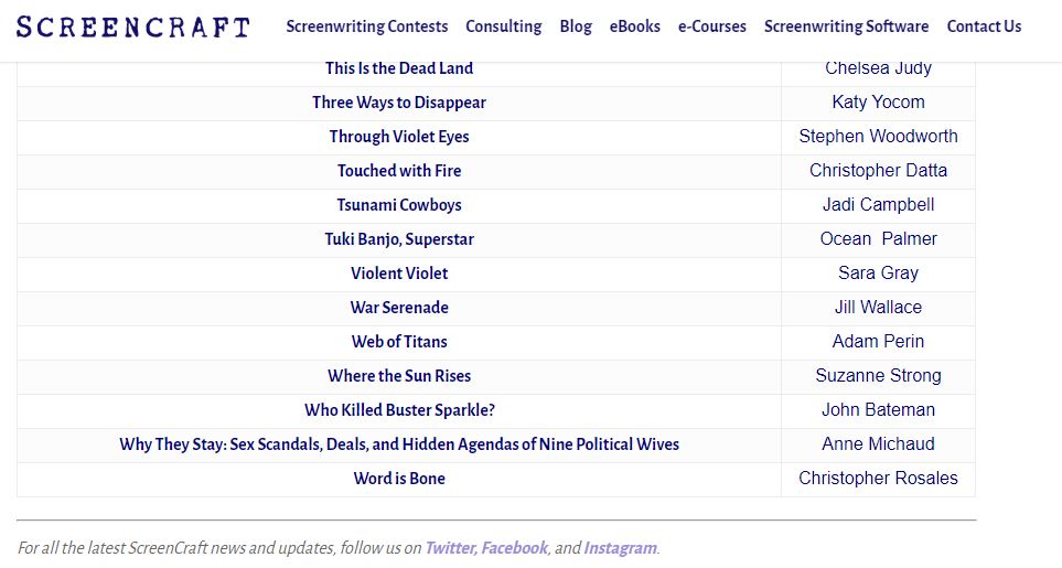 | Selected from over 1,200 submissions, we are pleased to present the semifinalists for the ScreenCraft Cinematic Book Competition. We’re excited to be exploring these excellent books and to have received a slate of so many compelling works. This year’s jury is comprised of literary agents from The Gersh Agency, United Talent Agency, and 3 Arts Entertainment. Stay tuned for the upcoming announcement of the finalists and winners here and on our Twitter and Facebook pages within the next few weeks! Take a minute to congratulate these talented writers on Twitter, Instagramand Facebook. See The Semifinalists Here |