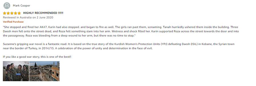 Suzanne’s gripping war novel, “Where the Sun Rises”, is a fantastic read. It’s based on the true story of the Kurdish Women’s Protection Units (YPJ) defeating Daesh (ISIL) in Kobane, the Syrian town near the border of Turkey, in 2014/15. A celebration of the power of unity and determination in the face of evil.